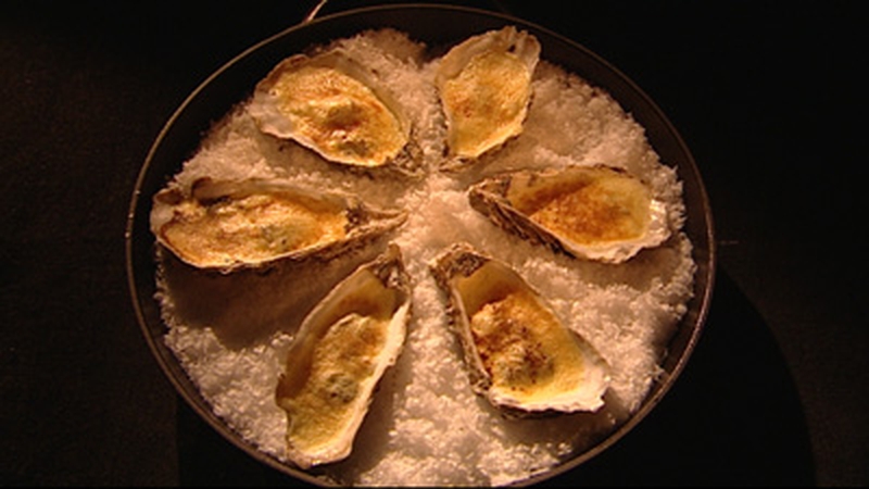 - Open the oysters over a large bowl in order to catch the water held in their shells, and set the flesh aside. Filter the liquid to remove any fragments of shell and pour it into a saucepan. Spread a deep layer of the sea salt on a large tray. Carefully clean the bottom half of each shell and wedge them in until they are steady in the salt.