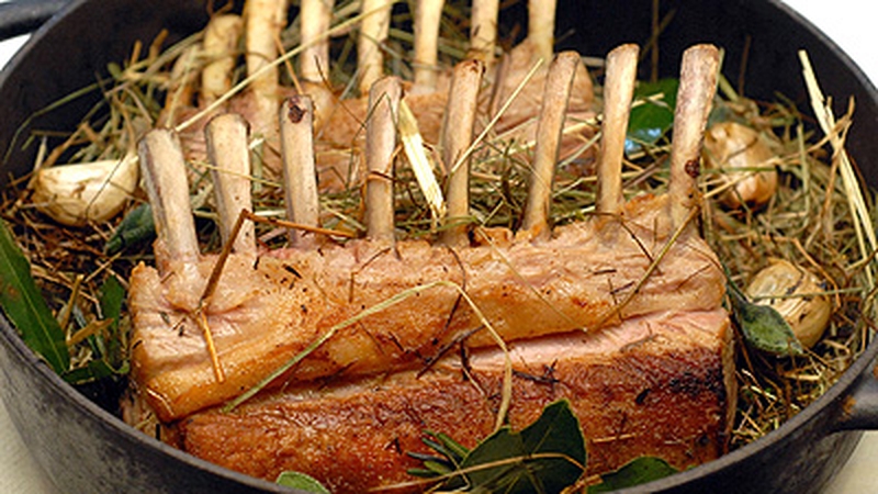 - Remove fat from back of rack, season with salt and pepper and brown all sides in hot sauté pan. Remove from pan and let cool. Spread generous amount of jelly on back of rack and pack good crust of breadcrumb mix on to meat. Bake in oven at 180°C for 15mins making sure crust doesn't burn.