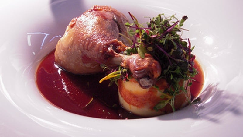 - Place the duck legs skin side down in the coarse sea salt and leave for 15 minutes. Scrape off the sea salt and place the legs into a ceramic dish with freshly ground black pepper, one crushed garlic clove, four sprigs of thyme and the bay leaves. Pack tightly into a ceramic dish, skin side down, then cover with a mixture of vegetable and olive oils, cover the dish with cling film and leave to marinate in the fridge for 24 hours.