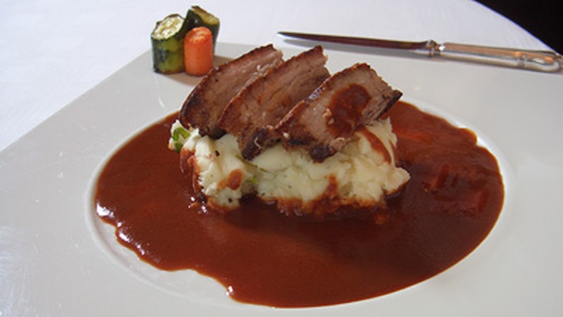 - Remove it from the cooking liquids and leave to rest, cut into portion and serve on mash or colcannon with some of the pan juices (be sure to skim off as much fat as possible).