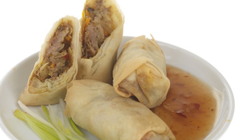 - Add some noodles, chicken, vegetables and herbs on the bottom of the paper facing you. Roll the paper over the ingredients once.
