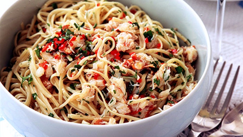 - Heat some olive oil in a medium frying pan and add the seafood, including the shellfish, pour over the tomato sauce and cover, cook for five minutes. Drain the pasta and divide between two serving dishes.