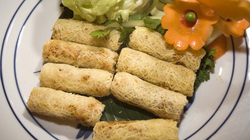 - To serve place around 2tbsp of the coconut dressed vegetables in the centre of the plate. Cut the spring roll down the centre at an angle. Place at either sides of the vegetables and garnish with mango salsa around the outside of the plate.