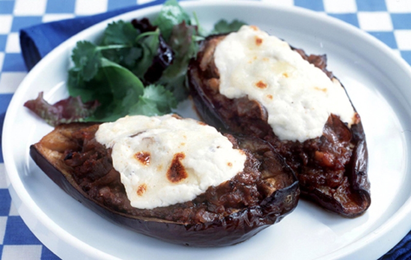 - Lightly spray your oven dish on which you are going to place the aubergine halves. Pile the vegetable meat filling inside the aubergines. Cut the mozzarella in thin slices and place over the filling.