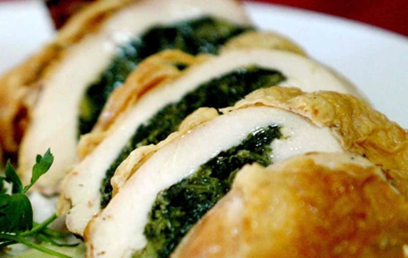 - Place spinach leaves and mozzarella over the breast of chicken, roll the