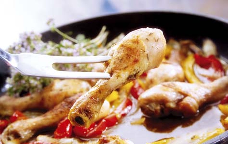 - Place the onion, potato and carrots on the bottom of your tray and place the chicken drumsticks over the vegetables.