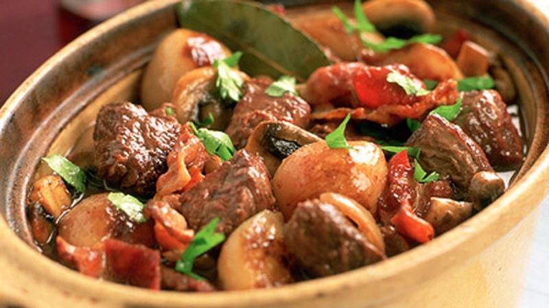 - To serve, spoon equal portions of the beef bourguignon onto warmed plates. Garnish with parsley and serve with baby boiled potatoes.