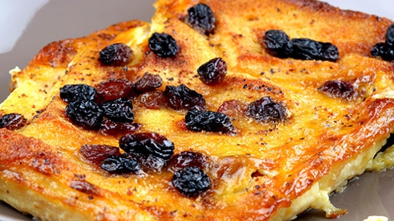 - Scatter over some of the sultanas and place another layer of the bread triangles on top and scatter over the remaining raisins. Press down gently with a fish slice or spatula.