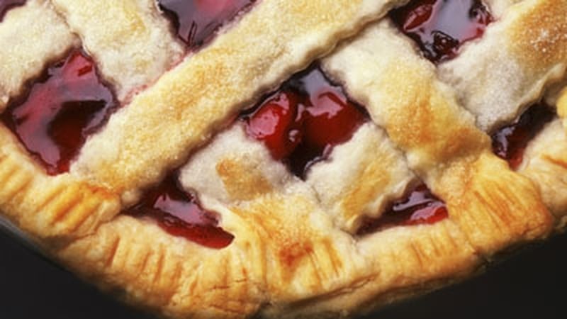- Place the lattice pastry on top brush with egg wash and sprinkle with sugar. Then trim off any excess pastry.