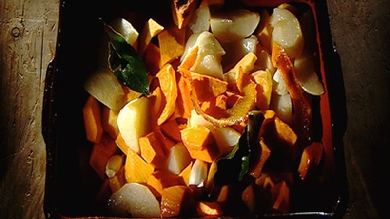 - You are going to roast the pumpkin with some turnip - just to offset its sweetness with a bit of bite from the turnip. The whole thing is pumped up with flavour from the honey, orange, garlic and bay leaves.
