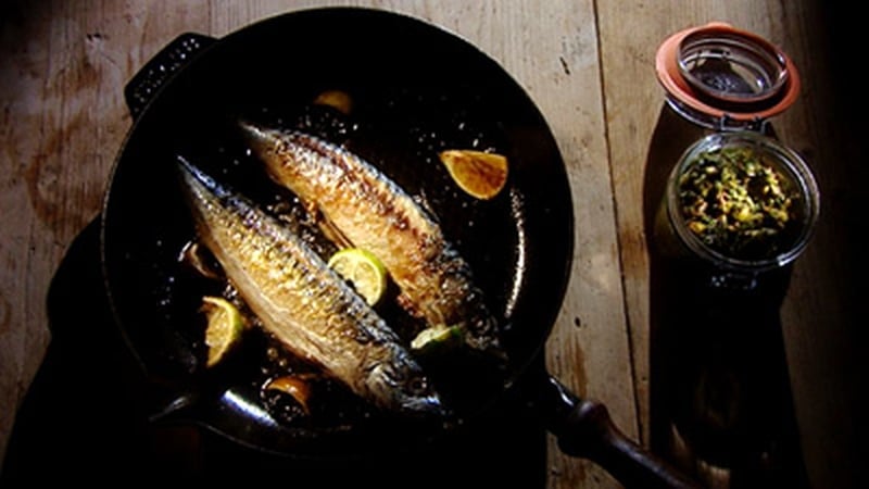 - The mackerel are just gutted to leave them whole, so put some oil on the fish rather than putting it in a pan.