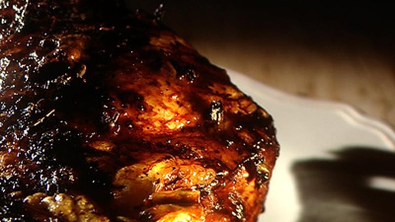 - Take the little burned sprigs of lavender out of the meat, then we are just going to spoon the glaze over it.