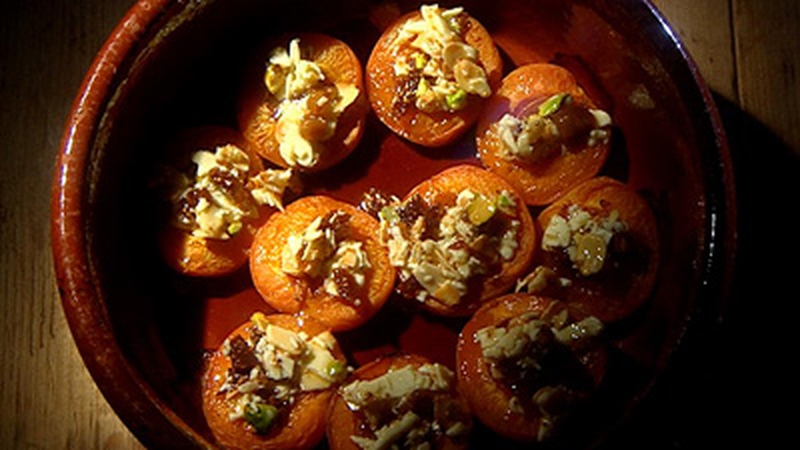- Among the various thing you can use in this recipe are dried apricots, prunes, really anything you happen to have in the cupboard - some pistachios to give it some colour, some almonds, chopped white chocolate (lots of it) and some honey to bind it all together.