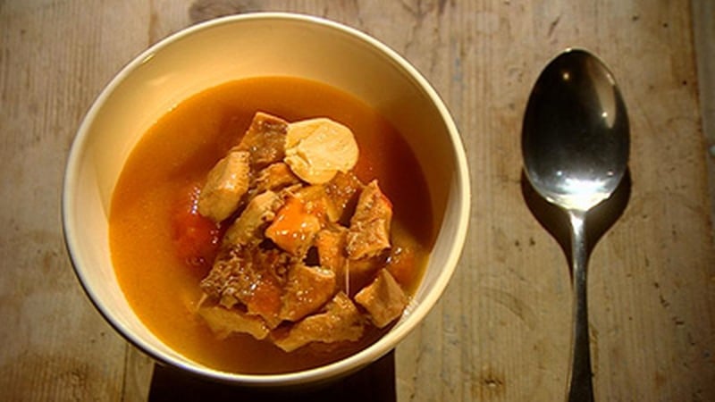 - And that’s it: a little stir, lid on and a very, very low heat, so that it simmers very gently for about three or four hours, so that the tripe gets really tender and soaks up all those flavours.