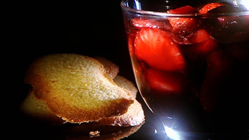 - After that it’s easy. All we do is chop up the strawberries, slice them thinly into a bowl and then pour over the strawberry soup. We’ll take the crispy golden biscuits out of the oven and we serve them together, a delicious warm or chilled summer dessert.