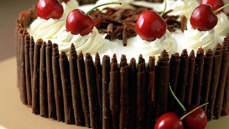 - Remove the sponge from the tins then cut them in half. Brush a little of the kirsch syrup over the sponge, then spread a layer of cream then a layer of cherry filling on top. Repeat this twice more.