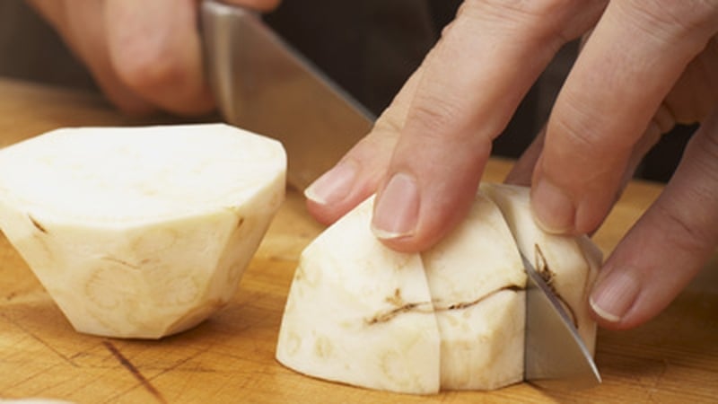 - Sweat the shallots with the butter and oil then add the diced celeriac and sweat until soft.