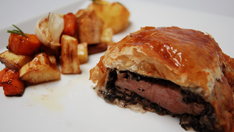 - Place the lamb on top and roll the pastry around it. Brush the pastry with a lightly beaten egg and place on a floured oven tray.