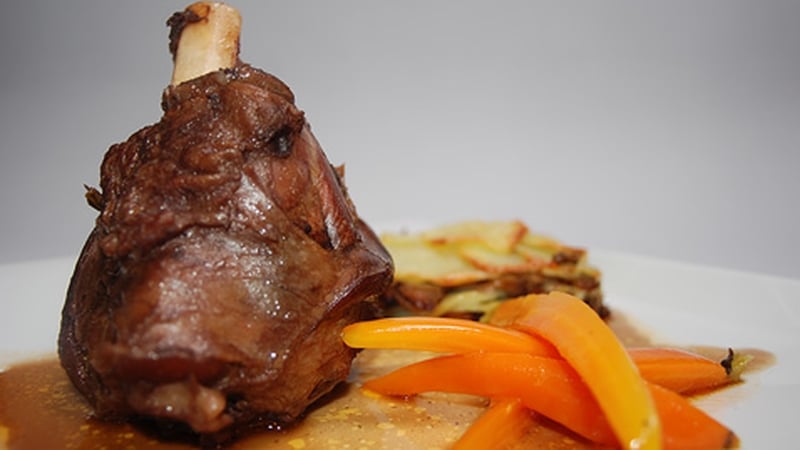 - Warm the lamb shanks in the reduced sauce over a medium heat. Place the mushroom and potato cake at the side of a serving dish, place two glazed carrots beside it and place the shanks next to it. Drizzle generously with the sauce and serve immediately.