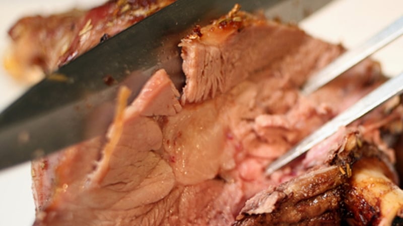 - When the lamb is cooked, transfer to a warm dish, then leave to rest in a warm place for 10 minutes. If you don’t like your lamb too pink you can cover it with foil at this point and it will continue to cook as the juices relax. Carve into slices and arrange on plates. Serve with roast baby new potatoes and dressed mixed salad leaves.
