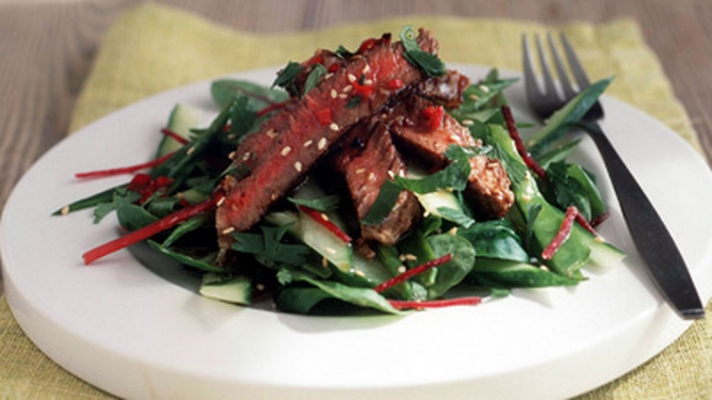 - Mix all the dressing ingredients together and lightly dress the leaves and top with the nuts, orange, sliced pigeon breast and diced feta cheese.