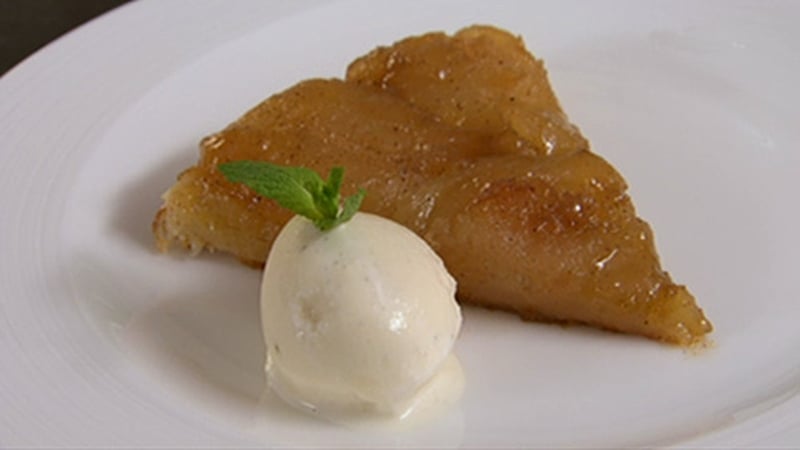 - Leave the tart in the tin for a minute or two, then loosen the edges with a round-bladed knife if necessary and invert on to a flat plate. Rearrange any apples which have loosened, moving them back into place with a palette knife, and allow to cool for a few minutes. This enables all the juices to be reabsorbed and allows the caramel to set a little. Cut into slices and serve on slightly warmed plates with scoops of vanilla ice cream.