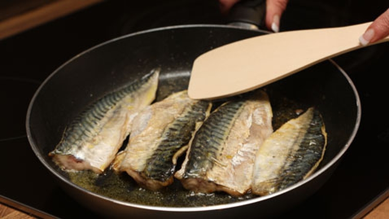 - Heat a nonstick pan, add a little oil and place mackerel skin side down.
