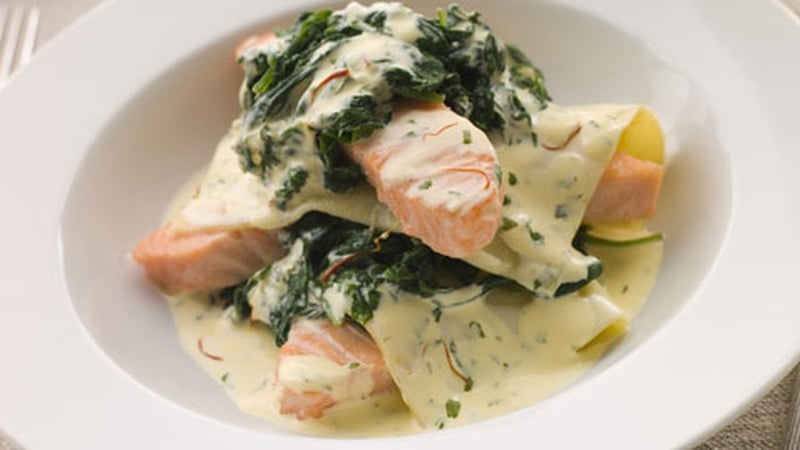 - On a preheated plate lay your first sheet of lasagne followed by a spoon of the fish cream, followed by another layer of pasta. Repeated this twice more and place the gruyere cheese on top of the final sheet of lasagne.