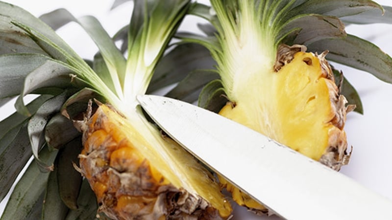 - Meanwhile, slice the top and bottom off the pineapple, sit it upright on a board and slice away the skin and all the little brown ‘eyes'. Using an apple corer, remove the core and then, using a very sharp knife, slice the pineapple as thinly as possible. Cover the base of a platter or individual plates with the slices and set aside.