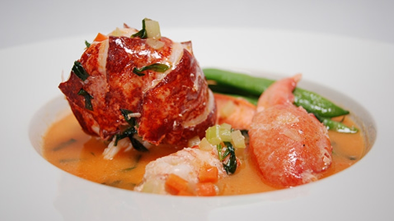 - In another saucepan, put the cooked lobster meat along with the diced vegetables and pour in a ladle of the lobster stock, the tarragon and butter. Season to taste. Simmer until the lobster is fully cooked, which should take around around 4 minutes. Remove the lobster with a slotted spoon and put into a deep bowl. Turn the heat up on the sauce, boil until it thickens a little and pour over the lobster. Reheat th beans and place alongside and pour the lobster sauce over everything. Serve immediately.