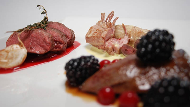 - To serve, slice the venison into three equal pieces and put a spoon of the sauce beside it at one side of your plate. Next slice the pigeon breast in half and put on the same plate and spoon a little berry sauce on top. Slice the rabbit loin in half and place on the plate with a little mustard sauce beside it. Lastly place the fondant potato beside the meat it and serve immediately.