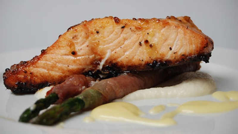 - To serve, place some celeriac purée in the centre of each plate, lay two asparagus spears on top and carefully place the salmon on the asparagus. Garnish with some beurre blanc.