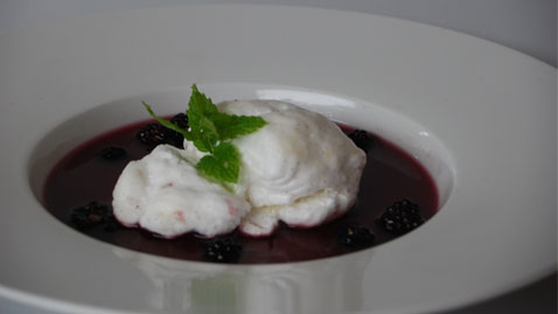 - To serve, pour some chilled Beaujolais and blackberry soup in a large serving bowl. Place the meringue on top and decorate with some blackberries and a sprig of mint.