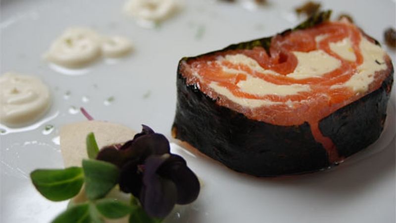 - When the terrine has set, tip it from the mould and remove the cling film. Place the Nori seaweed on some more cling film and dampen it slightly. Roll the salmon terrine in the seaweed and then roll in the clingfilm to keep the shape. Return the terrine to the fridge to chill for at least one hour.