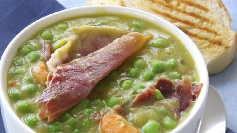 - Melt the butter in a large pot and cook the onion until soft. Add in the peas and the ham liquid and stir well.
