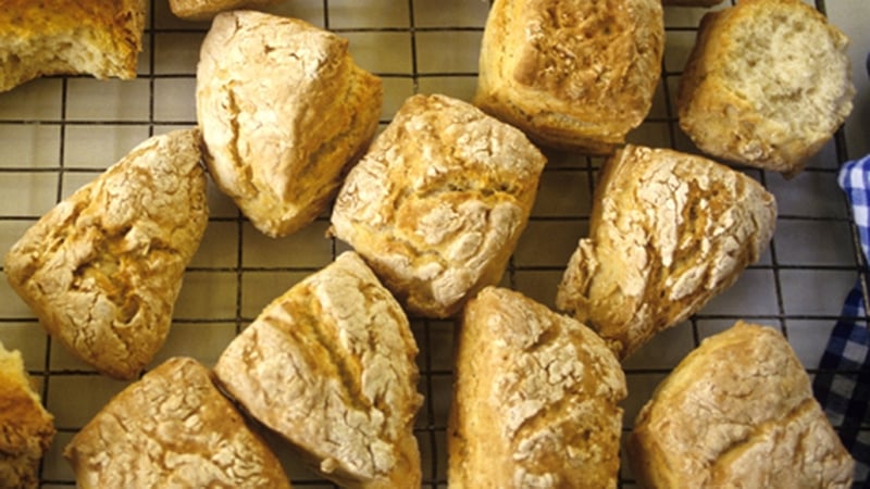 - When the dough comes together, turn it out onto a well-floured round or square shapes about the size of a scone, then place on a floured baking tray. Generously sprinkle each soda bread scone with the grated cheese.