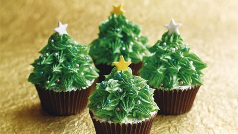 - Fill the piping bag with the green frosting and, working from the centre, pipe pointed branch shaped towards the edges of the cupcake. Keep doing this, turning the cupcake as you go, until you have the bottom of a tree. Repeat with the next layer up, making the branched shorter. Carry on with more layers, making the braches ever shorter as you get to the top of the tree.