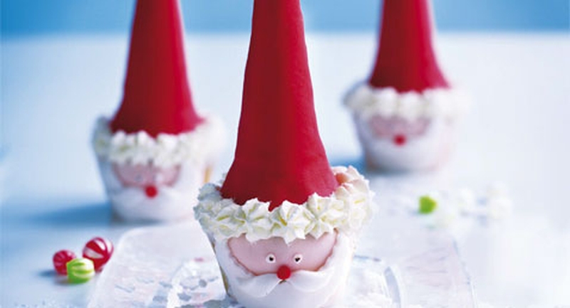 - Take about 75g (2½oz) of the remaining icing and tint it pale pink with a tiny dot of red food colouring. Roll this out thinly and stamp out 12 x 7cm discs. Brush one side of each of these with jam and stick to the front of the cakes. Roll out the untinted icing and using the cookie cooker stamp out 12 crescents for Santa’s beard. Brush one side of each crescent with cold water and stick to the bottom half of Santa’s face.