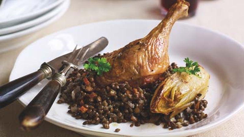 - Place the duck legs skin side up in a small roasting tin, season with salt and pepper and roast in the oven for 1 hour or until the skin is a rich golden brown and the meat comes away from the bone easily.