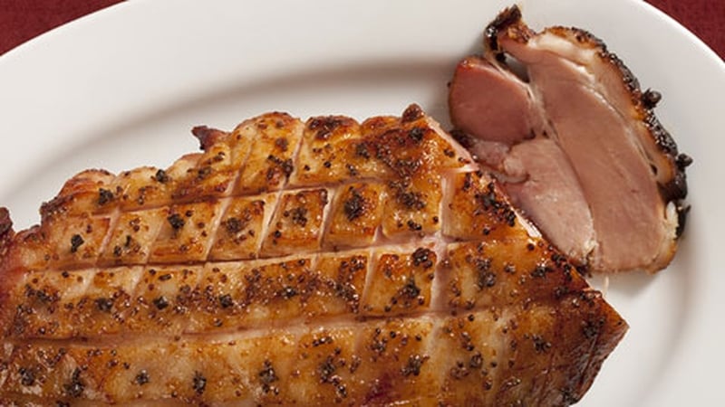 - Stand the ham on a piece of tinfoil and crumble it up to catch the juices as they run off the ham. Bake in a moderate oven until golden and crisp.