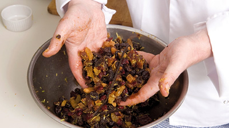 - Weigh out all the fruit, chopping the larger fruits into smaller pieces. Also add the zests at this point along with 1tbsp of rich, dark marmalade. Split the vanilla pod and add to the mix. Add the alcohol mix and leave to soak for a minimum of 24 hours, stirring occasionally. After soaking remove the vanilla pod.