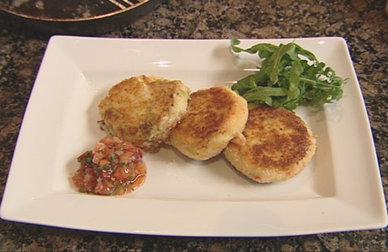 - Dice up sprigs of dill add them, salmon, crabmeat, cod into mixing container, strain cooked potatoes add butter milk and season to taste. Add to mixing bowl and thoroughly mix. Set aside.