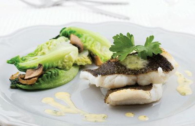 A beautiful dish of lemon sole and feta cheese fillets with prawns.