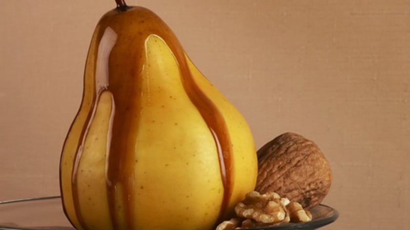 - Place the butter in a bowl and beat in the walnuts then use the mixture to fill the cavities of the pear halves. Drizzle over the golden syrup and bake for 25-30 minutes or until the pears are softened and the sauce at the bottom of the dish is bubbling.