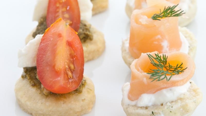 - To serve, top each Cheddar shortbread with a roasted cherry tomato half and crumble over a little feta. Garnish with the olives and arrange on a platter.