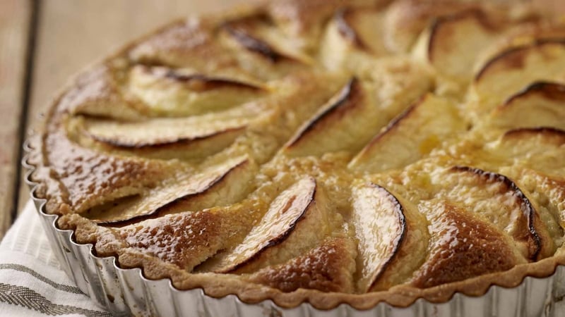- Peel the apples and cut into quarters to remove the cores, then cut into thin wedges. Tip into a bowl and toss in the lemon juice to prevent them from browning. Spread the almond filling in the pastry case and carefully arrange the apple slices on top in a fan shape and then gently press the apples down into the filling. Dot with the remaining 50g of the butter.