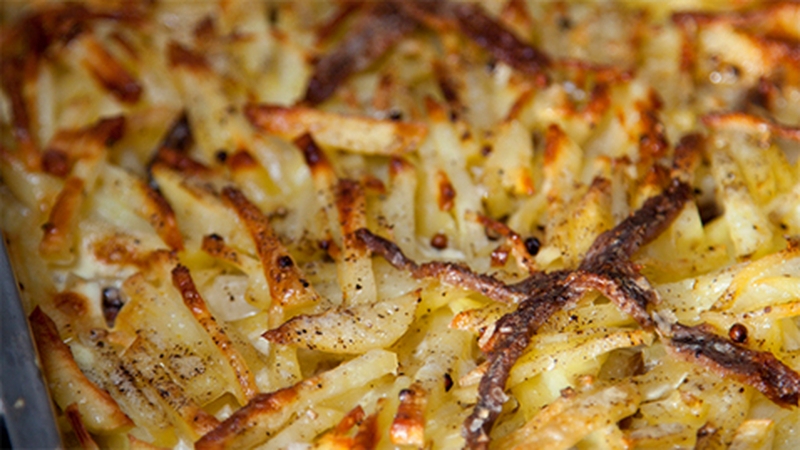 - Put half the potatoes into a large rectangular Pyrex dish. Evenly distribute the anchovy fillets and onions over the top of the potatoes and top with the remaining potatoes.