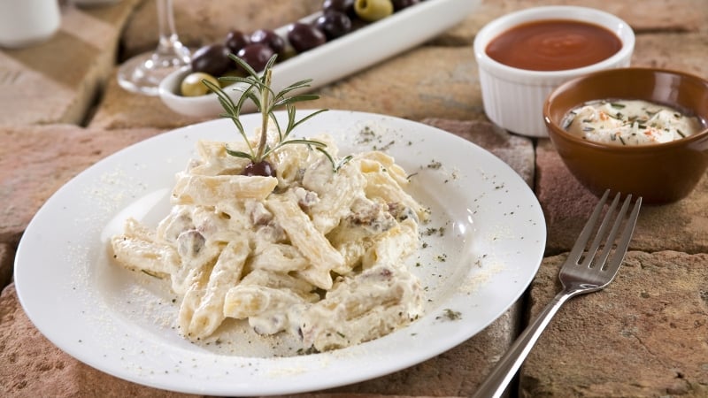 - Cook the penne pasta in seasoned boiling water until al dente. Bind the pasta with the sauce adding a drop of sherry vinegar.