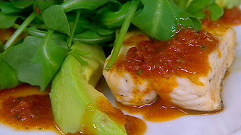 - To serve, cut each avocado in half and remove the stone, then carefully peel away the skin. Drizzle a little of the dressing into the centre of each plate and place a fanned out avocado half in the centre. Arrange three pieces of the salmon around the edge of each plate. Scatter around the rocket and drizzle over a little more of the dressing.
