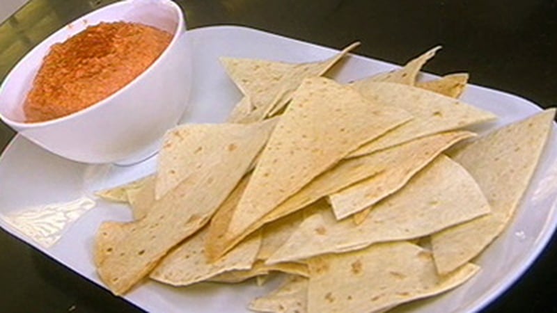 - Preheat the oven to 200°C (400°F/Gas 6). To prepare the tortilla chips, place two baking sheets in the oven for about 5 minutes until well heated. Meanwhile, brush both sides of the soft flour tortillas with olive oil, then cut in half. Cut each half into four triangles and arrange on the heated baking sheets. Place in the oven for 3-4 minutes until crisped up.